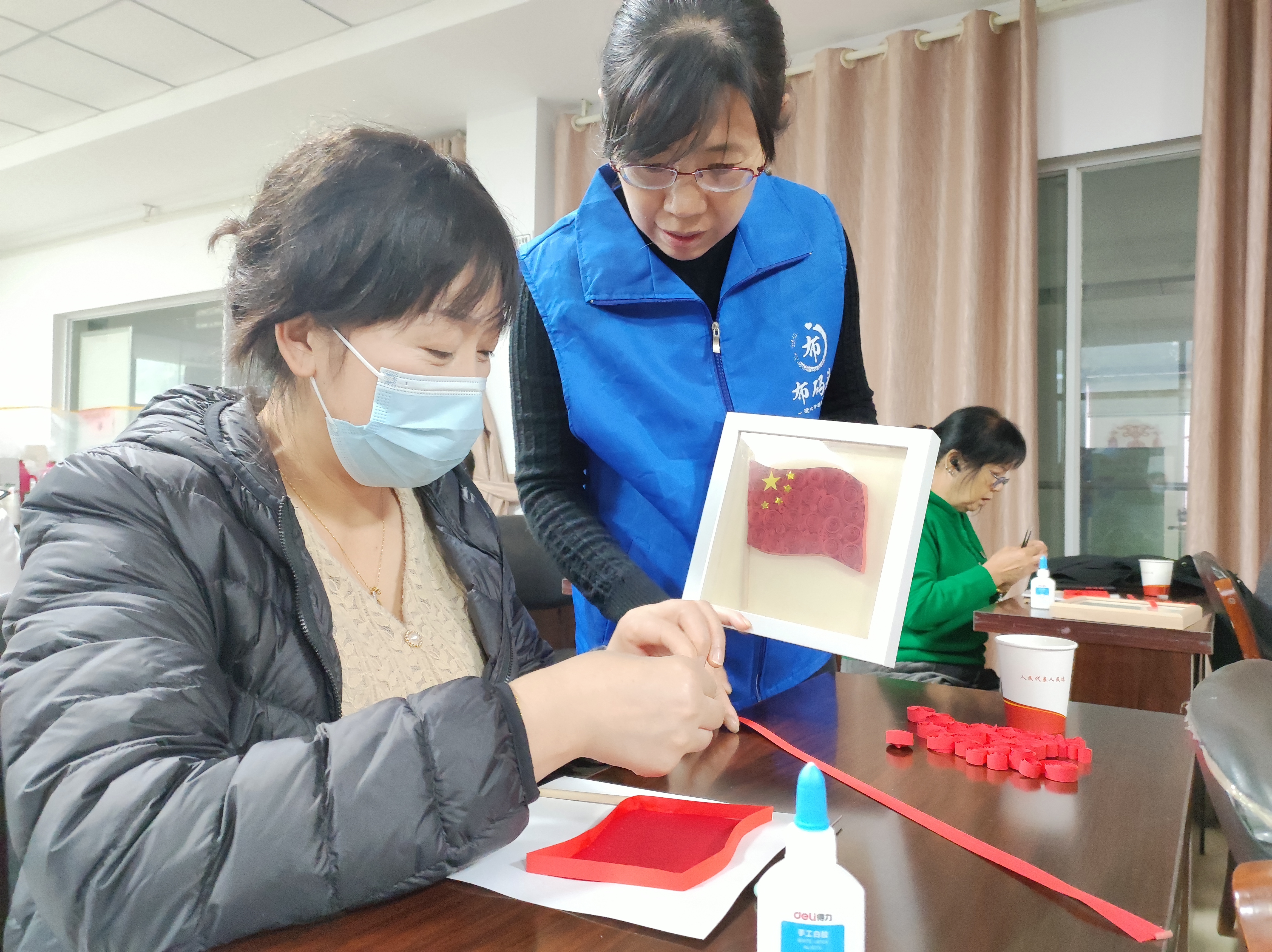 最后工作人员还带领大家一起用衍纸制作了党旗和国旗的工艺品摆台,在老师们的指导下,一条条大红色的衍纸化身为大大小小的圆圈并且紧紧的组合在一起,填充进旗子的外框中,象征着全国各族人民紧密地团结在一起,也深情的表达了大家对党的无限忠诚和热爱。活动最后大家纷纷与自己亲手完成的作品留念合影,本次活动也圆满的拉下了帷幕。